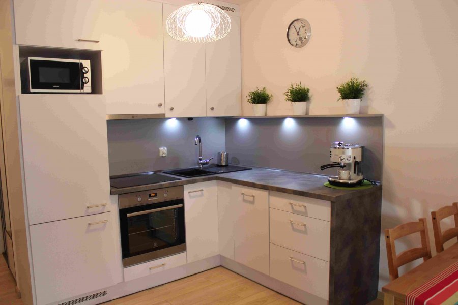 Na wyposażeniu znajduje się płyta indukcyjna, lodówka, piekarnik, zmywarka, mikrofalówka, czajnik, ekspres do kawy oraz wszystkie inne udogodnienia niezbędne do przygotowania i spożywania posiłków. Na balkonie z widokiem na las zdrojowy znajduje się stolik i 4 krzesła.